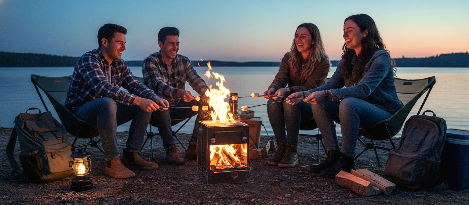 Our portable wood stoves turn every campsite into a cozy outdoor kitchen — perfect for lakeside dinners, fall evenings, and shared laughter under the stars.