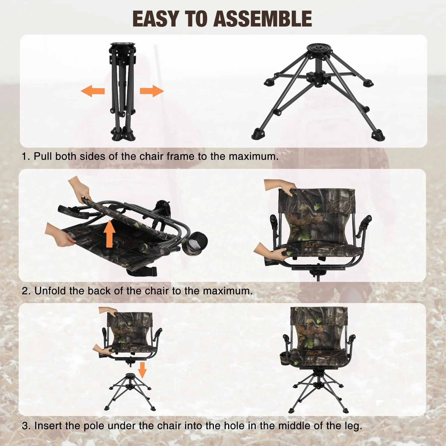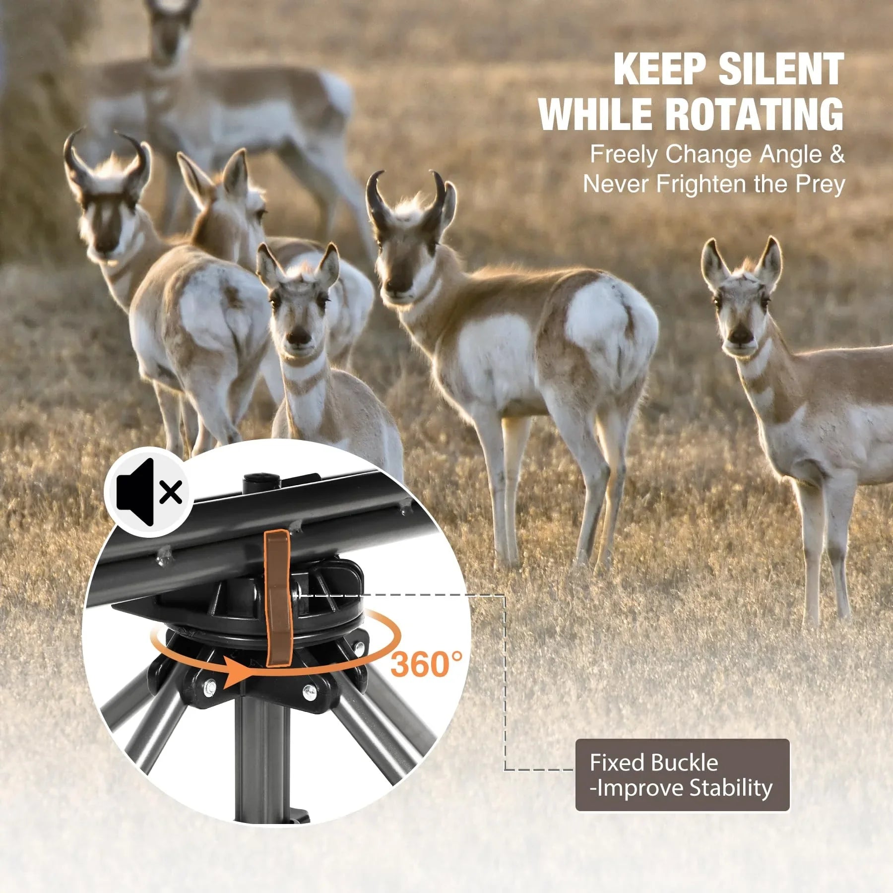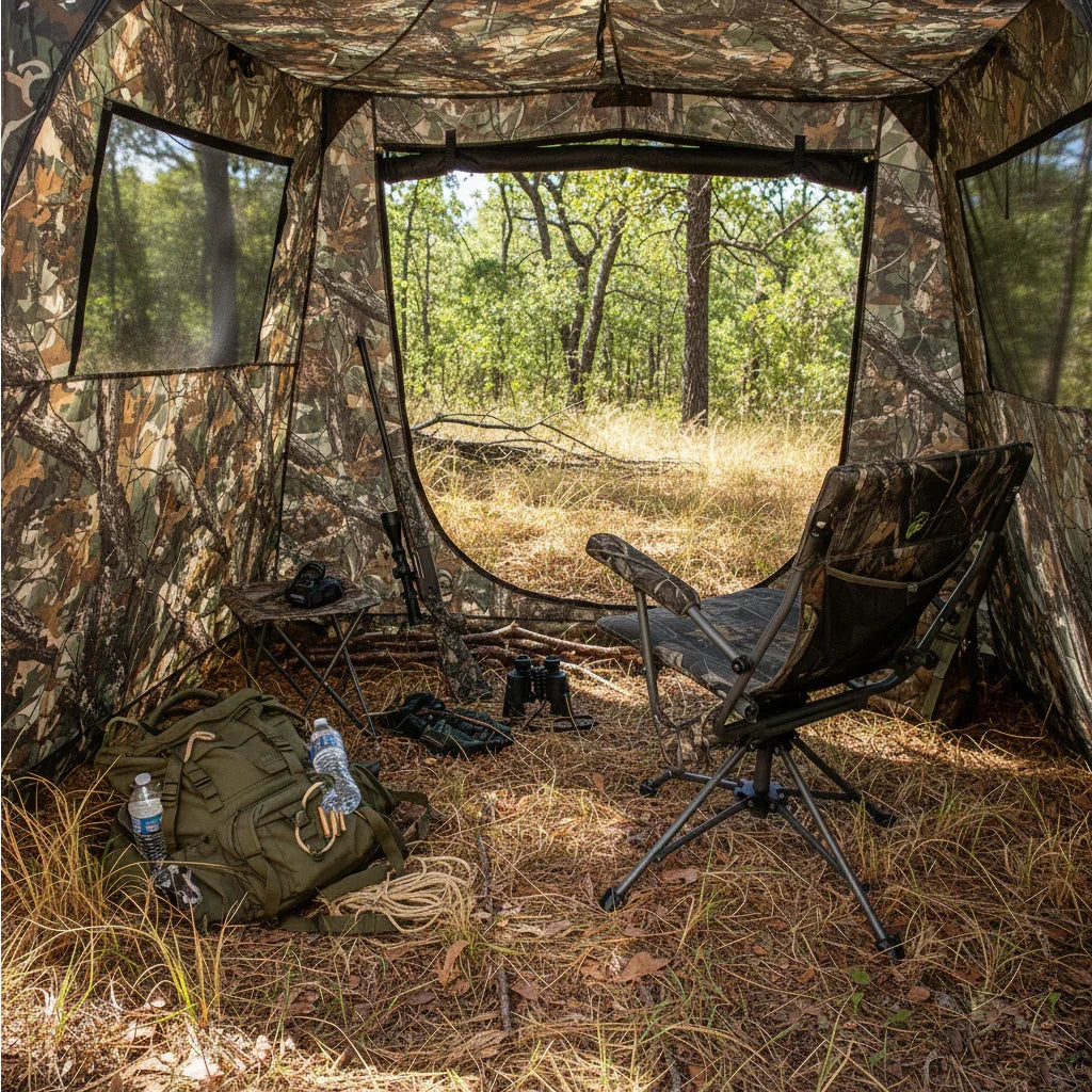 Achieve total concealment and unrestricted mobility inside your ground blind. This 360-degree swivel chair allows for silent, fluid rotation, enabling you to track moving game without startling it. Built with a rugged steel frame and large stabilizing feet, it provides a solid shooting platform on soft soil or uneven terrain, ensuring you remain steady when the moment counts.